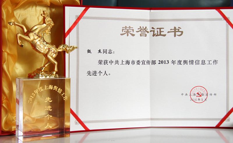 4月4日上午,上海市舆情信息工作会议召开,表彰2013年度上海市舆情信息工作先进,传达中宣部舆情信息工作会议精神。市委常委、宣传部部长徐麟同志出席会议并作工作讲话。根据《中共上海市委宣传部舆情工作考核奖励办法》,评选出10名同志为上海市舆情信息工作先进个人,我校甄杰同志获此殊荣。